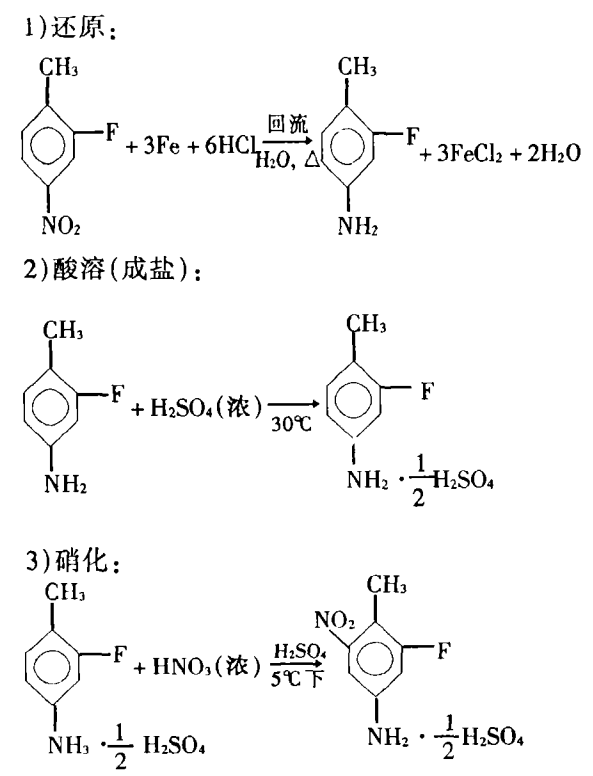 using 2-fluoro-4-nitrotoluene as raw material, 2-fluoro-6 with a content of 98% can be obtained through reduction, salt formation (acid dissolution), nitration, diazotization, alcoholysis and steam distillation. -nitrotoluene. the reaction equation is as follows: