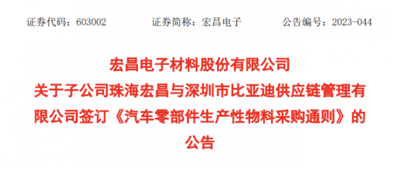on september 19, hongchang electronics announced that its subsidiary zhuhai hongchang and shenzhen byd supply chain management co., ltd. signed the “general rules for the procurement of production materials for auto parts”.