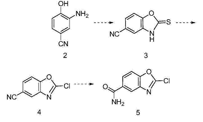for the preparation of 2-chlorobenzo[d]oxazole-5-carboxamide. 2-chlorobenzo[d]oxazole-5-carboxamide and related derivatives are widely used in medicinal chemistry and organic synthesis. 2-amino-4-cyanophenol (intermediate 2) is subjected to ring closure reaction to obtain 3; 3 is subjected to chlorination reaction to obtain 4; 4 is subjected to hydrolysis reaction to obtain 2-chlorobenzo[d]oxazole-5 -formamide (intermediate 5), the synthesis route is as follows: