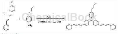 preparation process: accurately weigh 5.70g (0.02mol) of the product synthesized in the second step, 1-chloro-4-(4-phenyl-1,3-butadiene)benzene, in the glove box, 0.035g ( 0.1 mmol) 2-(dicyclohexylphosphino)biphenyl, 2.9 g (0.03 mol) sodium tert-butoxide and 0.022 g (0.1 mmol) palladium acetate. under ar gas protection, 1.49g (0.01mol) p-n-butylaniline and 150ml anhydrous and oxygen-free o-xylene were injected into the mixture, and the mixture was reacted at 130°c for 5 hours. after the reaction is completed, distill under reduced pressure at 80°c to obtain a brown liquid. cool to 15°c overnight to obtain a brown solid; after washing with o-xylene, dissolve the solid in o-xylene at 70°c. , add silica gel, stir for 2 hours, filter while hot, and wash the silica gel with o-xylene. collect the filtrate, distill under reduced pressure at 80°c, and cool to 15°c to obtain a yellow solid; filter, then wash with o-xylene, and finally use wash with ethyl acetate and dry under reduced pressure at 70°c to obtain yellow-green powder. yield 66%. characterization: m.p.160~161°c.1hnmr (400mhz, cdcl3): 7.42 (d, 4h, j=8hz), 7.29 (d, 8h, j=12hz), 7.21 (d, 2h, j=8hz), 7.08 (d, 2h, j=8hz), 7.02 (d, 6h, j=8hz), 6.97-6.91 (m, 2h), 6.87-6.81 (m, 2h), 6.62 (d, 2h, j=4hz), 6.60 (d, 2h, j=4hz), 2.58 (t, 2h, j=8hz), 1.64-1.56 (m, 2h), 1.42-1.33 (m, 2h), 0.94 (t, 3h, j=8hz) .