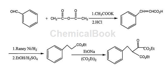 method 2: using benzaldehyde as the starting material, condensation with acetic anhydride, hydrogenation and esterification of cinnamic acid to obtain ethyl phenylpropionate, and condensation of ethyl phenylpropionate and diethyl oxalate to obtain 3-benzyl-2 – diethyl oxosuccinate, and finally 3-benzyl-2-oxosuccinate diethyl is hydrolyzed and esterified to produce 2-oxo-4-phenylbutyric acid.