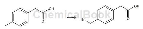 put the raw material p-toluene acetic acid (24 grams) into a 250 ml three-port, add 80 ml of chlorobenzene, 30 g of nbs, and 0.6 g of azobisisobutyronitrile, and heat to 85°c under mechanical stirring. after the reaction is initiated, the temperature will automatically rise to 110°c to control the reaction between 90 and 110°c, and the reaction will be kept in this temperature range for 4 hours. the tlc plate will monitor that the reaction is complete. after cooling, a solid precipitated. after filtration, the filter cake was washed with water and filtered as dry as possible. the resulting white solid weighed 33.0 grams after drying, with a yield of 90% and an hplc purity of 98.7%. 1hnmr (dmso-d6, 300mhz) δ: 12.2 (s, 1h), 7.18-7.23 (m, 4h), 4.69 (s, 2h), 3.57 (s, 2h).