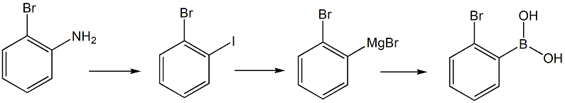 using o-bromoaniline as raw material, the intermediate o-bromoiodobenzene is synthesized through diazotization and iodination, and then exchanged with isopropyl magnesium bromide for iodomagnesium to synthesize o-bromophenyl magnesium bromide, and then combined with trimethyl borate methyl o-bromophenylborate is synthesized by substitution reaction, and then 2-bromophenylboronic acid is synthesized by hydrolysis.