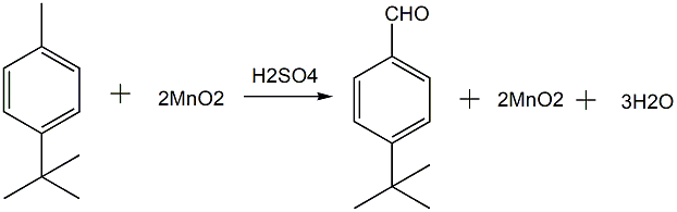 chemical oxidation method refers to the use of oxidants other than air and oxygen to oxidize p-tert-butyltoluene. the oxidants used are mno2, h2o2 and organic peroxide (tbhp). the traditional industrial production of p-tert-butylbenzaldehyde uses chemical oxidation method, that is, using mno2 as the oxidant, and directly oxidizing p-tert-butyltoluene in h2so4 to synthesize p-tert-butylbenzaldehyde. the chemical reaction formula is as follows: