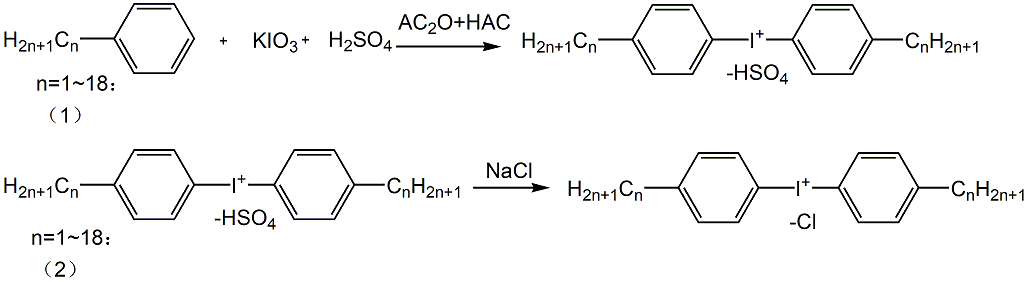 since iodonium salt is insoluble in non-polar solvents, the photopolymerization system in which it is used as a photoinitiator must use polar solvents to dissolve the monomers, such as methanol, chloroform, etc. and because its negative ions (asf6-, sbf6-, etc.) are toxic, its application is limited to a great extent. in response to these problems, new iodonium salts have been synthesized in recent years, mainly to improve solubility in less polar solvents and reduce toxicity. for example, the curing speed of siloxane polymerization used to initiate functionalization can reach 457m/min, so [b(c6h5)4-] has a strong tendency to replace sbf6-. bis(4-tert-butylphenyl)iodine chloride is an iodonium salt compound, and studying its synthesis is of great significance.