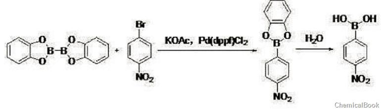 in the first step, add 500.0g dmf, 101.0g 4-nitrobromobenzene (0.50mol, 1eq), and 130.8g dicatecholboric acid into a 1l four-necked flask with magnetic stirring under nitrogen protection. ester (0.55mol, 1.2eq), 147.2g potassium acetate (1.5mol, 3eq), 18.3gpd(dppf)cl2 (0.025mol, 0.05eq), react at 80°c for 3h. lower the temperature to 20~25°c, filter, add the filtrate dropwise to 500.0g of water, stir for 1 hour, and raise the temperature to 20~25°c. extract twice with ethyl acetate (200 ml %.
