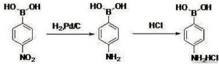 in the second step, dissolve 63.7g 4-nitrobenzene boric acid (0.38mol, 1eq) into 255g ethyl acetate, add 2.0g palladium carbon (10%, 0.005eq), 0.8~1.0mpa, 70~80 ℃ hydrogenation reaction for 6 hours, the reaction is completed, use diatomaceous earth to filter, the filtrate is cooled to 0℃, dropwise add 51.0g concentrated hydrochloric acid (30%, 0.38mol, 1.1eq), stir at 0~10℃ for 0.5h, filter, filter cake use 80g acetone to beat to obtain 52.4g off-white solid 4-aminobenzene borate hydrochloride, hplc: 98.2%, the second step yield is 79.2%, and the total yield is 60.4%.