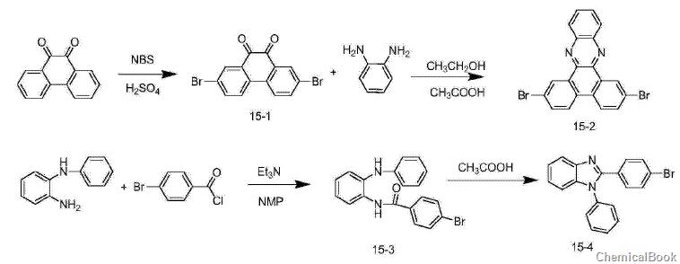 1) synthesis of compound 15-1: in a three-necked flask, add phenanthrenequinone (6.24g, 30mmol) and concentrated sulfuric acid (50ml), slowly add nbs (11.2g, 63mmol) at 0°c, and react for 2 hours. , slowly pour the reaction solution into ice water, filter, and the obtained solid is recrystallized with dimethyl sulfoxide to obtain 5.6 g of orange solid, with a yield of 50%.