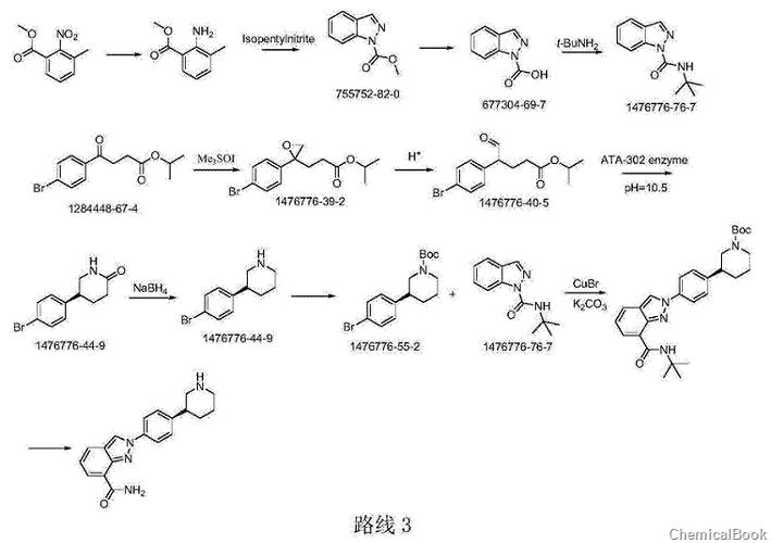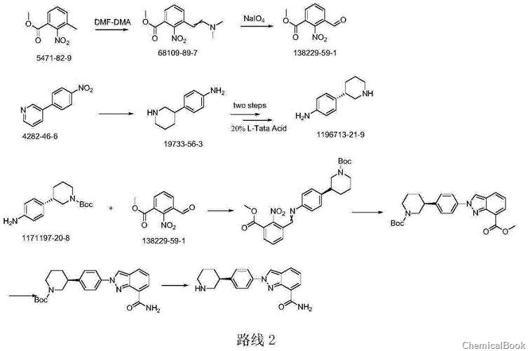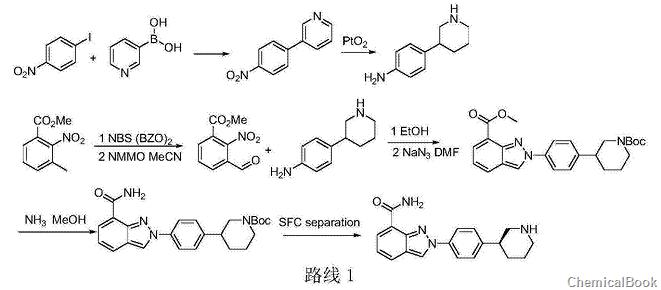 route 2 org.processres.dev.2011,15,831–840 reports: this synthetic route first obtains (s)-3-(4-aminophenyl)piperidine through chiral resolution, and then combines it with 3- formyl-2-nitrobenzoic acid methyl ester is condensed, and a pyrazole ring is constructed under the action of sodium azide, and then the niraparib molecule is synthesized under the conditions of ammonia gas and acid. in this route, the pyridine ring is reduced platinum oxide is also used, which is relatively expensive. the sodium azide method is also used to construct the pyrazole ring, which is not conducive to amplification.