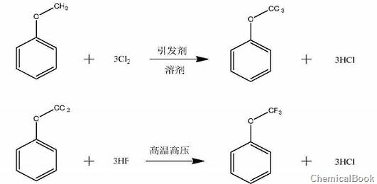 add 150g of p-chlorotrifluorotoluene solvent into a 1000ml reactor equipped with mechanical stirring, condenser tube, thermometer, bottom vent tube, and dropper tube, start stirring, and raise the temperature to 139~140°c until the solvent refluxes. when the temperature is high, pass the chlorine gas and start to add dropwise a mixed solution of 200g anisole, 600g p-chlorotrifluorotoluene solvent and 10g azobisisobutyronitrile initiator. add dropwise at 139~140°c for about 12 hours. after the dropwise addition is completed, after sampling and analysis, when dichloromethoxybenzene is lower than 0.3%, stop the reaction and cool n.