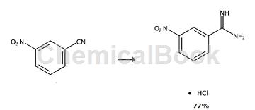 weigh 74g (0.5mol) of 3-nitrobenzonitrile into a 250ml round-bottomed flask, add 200ml of methanol to dissolve it, and add 5.6g (0.052mol) of a methanol solution of sodium methoxide with a mass percentage of 50%, at room temperature. the reaction was stirred under magnetic stirring for 4 h. after adding 27.5g (0.515mol) of ammonium chloride into the above system, the reaction was continued at room temperature for 48h. tlc tracks the end point of the reaction. after the reaction, the solvent is evaporated to dryness. the remaining solid is washed with diethyl ether, filtered, and repeated three times. the filter cake is sequentially recrystallized with hot water (about 60°c) and ethanol to obtain orange needle-like crystals of 3-nitrobenzene. amidine hydrochloride 78g. yield 77.4%.