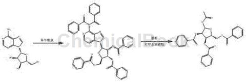 (1) benzoylation reaction: add 53.4g adenosine and 110g triethylamine to 500ml methylene chloride, heat to dissolve, cool to 5-10°c in an ice water bath, add 160g benzoyl chloride dropwise, control the reaction temperature to not exceed 15°c, and complete the dropwise addition in 30 minutes. after the dropwise addition, the temperature is raised to 20-30°c and the reaction is completed in 12h. suction filtration, wash the filter cake with an appropriate amount of methylene chloride, combine the filtrate, concentrate to dryness under reduced pressure to recover the solvent, add methanol to the remaining residue, stir and beat, filter to obtain crude product, dry in a blast drying oven to obtain 145g of white benzoyl material .