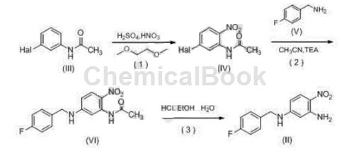 step 3: hydrolysis reaction: dissolve compound (vi) (60.6g, 0.1mol) in ethanol (400ml), water (120ml), and concentrated hydrochloric acid (160ml) into a 1l reaction bottle, at 70~80°c stir for 1 hour. after the reaction solution becomes red and clear, cool to 10°c, adjust the ph to neutral with 4moll-1 sodium hydroxide solution, filter with suction, wash the filter cake with water, and dry with suction to obtain a yellow solid 2-amino-4. -[(4-fluorobenzyl)amino]-1-nitrobenzene 51.2g, yield 98%, mp 112~113°c.