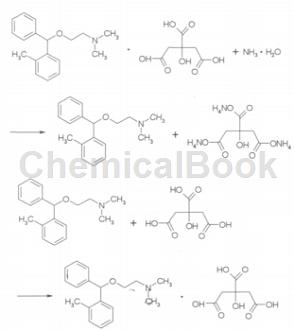 another preparation method: in a 250ml reaction bottle, add 17.5g n, n-dimethylethanolamine and 20g 2-methyldiphenylmethane respectively, stir and heat to 100°c, react for 2 hours, after the reaction is completed cool n. the upper solution was dissolved in 140 ml of diethyl ether, washed three times with 40 ml of water, dried by adding anhydrous k2co3, filtered, and the solvent was drained to obtain 13.6 g of the intermediate, with a yield of 56.0%. dissolve 10.6g citric acid in 250ml isopropyl alcohol, slowly add 13.6g intermediate, stir and react for 0.5h, white crystals precipitate, wash 3 times with isopropyl alcohol, and dry to obtain 16.2g crystalline solid, with a yield of 70.0% .