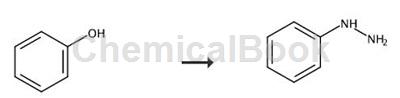 place 188g of phenol, 166.7g of 90% hydrazine hydrate and 37.6g of d81 macroporous resin in a four-necked flask with stirring, thermometer and distillation column, start stirring, and heat to 110℃~120℃ , extract water vapor at a temperature of 98°c to 100°c at the top of the distillation column, react for 6 to 8 hours, end the reaction when no condensed water flows out from the top of the distillation column, and then recover excess hydrazine hydrate by distillation under reduced pressure. after the recovery of hydrazine hydrate is completed use a centrifugal filtration device to separate the d81 macroporous resin, and wash the remaining liquid with an appropriate amount of sodium carbonate solution and pure water to obtain 200.6g of phenylhydrazine.