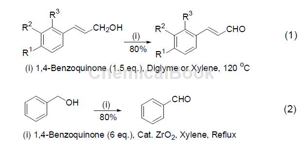 1,4-benzoquinone is a commonly used oxidizing reagent or dehydrogenating reagent because it can be easily reduced to hydroquinone by other compounds, thus showing oxidative activity. and its own oxidation potential determines that 1,4-benzoquinone can selectively oxidize conjugated primary allyl alcohol in the coexistence of multiple alcohol compounds, such as selectively oxidizing conjugated primary allyl alcohol in the coexistence of secondary alcohols and benzyl alcohol. oxidation of cinnamic alcohol to cinnamaldehyde (formula 1)[1]. in addition, the oxidation reaction of primary alcohol can also be achieved by using 1,4-benzoquinone as the dehydrogenation reagent and hydrated zirconium oxide as the catalyst (equation 2).