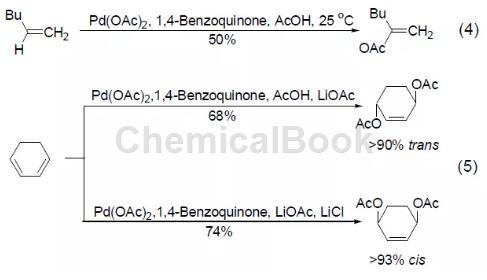 the representative use of 1,4-benzoquinone is as a co-oxidant in the palladium acetate catalytic reaction, which re-oxidizes the pd(0) produced after reduction and elimination into pd(ii) and enters the catalytic cycle. for example, the oxidative coupling reaction between olefins and acetic acid is achieved with 0.1 times the amount of palladium acetate and 1 times the amount of 1,4-benzoquinone (formula 4)[4]. the 1,4-benzoquinone and palladium acetate oxidation system can also achieve the conversion of 1,3-cyclohexene into 1,4-acetoxy-2-cyclohexene with a higher yield (formula 5) [5], reaction the product will be affected by other adducts. for example, in the presence of lithium acetate, the main product of the reaction is trans-diacetoxy compound; in the presence of lithium acetate and lithium chloride, the main product of the reaction is cis diacetoxy compound.