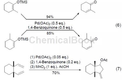 in addition, the 1,4-benzoquinone and palladium acetate oxidation system can also realize the conversion of methylsilane enol ether to conjugated enone, and the reaction has very good regioselectivity and stereoselectivity (formula 6) [ 6]. combining 1 part of manganese oxide reagent, 0.05 part of palladium acetate and 0.2 part of 1,4-benzoquinone can also achieve 1,5-hexadiene