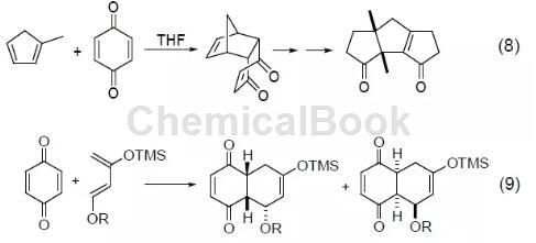 another important type of reaction of 1,4-benzoquinone is as a dienophile reagent. because of the electron-withdrawing effect of the carbonyl group, 1,4-benzoquinone is a good electrophile, and the diels-alder reaction can be easily achieved in the presence of electronegative diene substrates. a typical example is the diels-alder reaction of 1,4-benzoquinone and 1-methyl-1,3-cyclopentadiene in the total synthesis of capnellene reagent, which provides a good reaction precursor for the final product ( formula 8)[8]. in addition, there are many reports on the asymmetric diels-alder reaction involving 1,4-benzoquinone (equation 9).