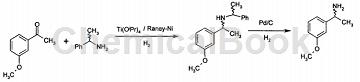 cn200610116949.3 provides a new method for preparing optically active 1-(3-methoxyphenyl)ethylamine, the key intermediate of rivastigmine, which method includes making m-methoxyacetophenone the step is to perform an asymmetric reductive amination reaction with optically active phenylethylamine in an organic solvent under a combined reduction system. subsequently, a debenzylation reaction is performed to obtain optically active 1-(3-methoxyphenyl)ethylamine. the synthesis route is as follows: