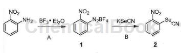 step b: in an ice-water bath, a solution of potassium selenocyanate (8.0g, 55.5mmol) in water (80ml) was added dropwise to a mixture of compound 1 (13.0g, 54.9mmol) and water (300ml). when finished, continue stirring for 30 minutes. filter, wash the filter cake with a small amount of water, and dry it under vacuum at 60°c to obtain 2-nitrophenyl silk cyanate (2) (11.2g). the yield is 89.8%.
