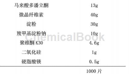 pass domperidone maleate and all excipients through a 100-mesh sieve separately and set aside; weigh the prescribed amount of microcrystalline cellulose, starch, and sodium carboxymethyl starch, pass them through an 80-mesh sieve, and mix with the main drug. the pure aqueous solution made by adding 38 ml of pure water to ketone k3 0 is a soft material made of adhesive. granulate through a 16-mesh sieve, dry at 65°c for 1 hour, and make 16-mesh granules. weigh the prescribed amount of silica and magnesium stearate. mix together and press into tablets to obtain.
