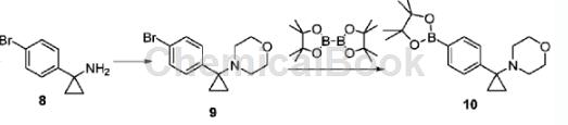 dissolve 1-(4-bromobenzene)cyclopropylamine (1.70g, 8.015mmol) in n,n-dimethylformamide (20ml), place it in a sealed tube, and add 2,2′-dibromo diethyl ether (1.4 ml, 8.816 mmol) and n,n-diisopropylethylamine (2.7 ml, 16.03 mmol). the reaction was heated to 100°c and stirred for 16 hours. cool to room temperature, add ethyl acetate, and wash with water. the organic phase is dried, filtered, and concentrated under reduced pressure. the crude product is separated and purified by column chromatography to obtain intermediate 9 (2.23g), with a yield of 42%. intermediate 9 (2.23g, 7.902mmol), bis-pinacohol boronate (2.21g, 8.692mmol), [1,1′-bis(diphenylphosphorus)ferrocene]palladium dichloride ( 347 mg, 0.4741 mmol) and potassium acetate (1.16 g, 11.85 mmol) were dissolved in 1,4-dioxane (30 ml), heated to 90°c, and reacted for 16 hours. concentrate to dryness under reduced pressure, add ethyl acetate, wash with brine, dry, filter, concentrate and separate by column chromatography (petroleum ether/ethyl acetate = 6:1, v/v) to obtain compound 10 (1.75g). the rate is 67%.