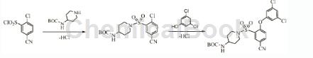dissolve 2-chloro-5-cyanobenzene-1-sulfonyl chloride (8.00g) in 100ml thf, and add n-boc-4-aminopiperidine (5.79g). slowly equals 6. k2co3 was added and the mixture was stirred at room temperature for 1 hour. 3,5-dichlorophenol (11.06g) and 18-crown-6 (4.66g) were added and the reaction was stirred at reflux (75°c) for 4 days. the mixture was cooled and vacuum filtered, and the filtrate was concentrated in vacuo, redissolved in dichloromethane, partitioned with water, and the aqueous layer was extracted three times with dichloromethane. the combined organic layers were washed with saturated sodium bicarbonate, water, brine and dried over mgso4. the filtrate was concentrated in vacuo, triturated with dichloromethane/diisopropyl ether and vacuum filtered to give a yellow powder. the powder was recrystallized in meoh to give the product as a white powder (14.50 g, 87.3%).