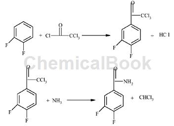 2) add 2093 kg of dichloroethane solution containing 493.0 kg (1.9 kmol) of 3,4-difluoro-(α,α,α-trichloroacetyl)benzene into another reactor, stir ventilate ammonia and control the reaction temperature to 20-30°c. a white solid will precipitate. after the raw material reaction is complete, filter and wash, and dry to obtain 289.6 kilograms (1.843 kmol) of 3,4-difluorobenzamide, with a yield of 97%.