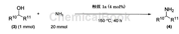 2) under an argon atmosphere, add compound 1a (4.0mol%) as a catalyst, 28% ammonia water (20mmol), and 1-(o-chlorophenyl)ethanol 3a into a stainless steel sealed container (internal volume 5ml). (1.0 mmol) and stirred at 150°c for 40 hours. after cooling the reaction solution, the contents were transferred to a test tube, and the product 1-o-chlorophenylethylamine was extracted with dichloromethane (15 ml). the crude product obtained by distilling off the solvent was purified by silica gel chromatography (eluent: hexane/ethyl acetate mixed solvent) to obtain 1-o-chlorophenylethylamine 4b (yield 83%).