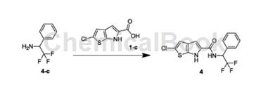 the specific steps are: 1-phenyl-2,2,2-trifluoroethylamine (324.99mg, 691.74umol, 1.10eq) and 1-c (150.00mg, 628.85umol, 1.00eq) at 25°c ) was dissolved in dmf (10.00ml) and then tbtu (302.87mg, 943.27umol, 1.50eq) and dipea (243.82mg, 1.89mmol, 329.48ul, 3.00eq) were added. the resulting mixture was stirred at 25°c for 12 hours. reaction completion was detected by tlc (pe/ea=3/1) and lc-ms. water (20 ml) was added to the reaction solution and extracted with ea (50 ml*3). the organic phases were combined and washed with saturated brine (30 ml*2), dried over naso4, filtered and concentrated to obtain the crude product. the crude product was purified by prep-hpl (column: bostongreenods150*305u; mobilephase: [water (0.225% fa)-acn]; b%: 55%-82%, 10min) to obtain compound 4.