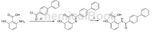 2) combine the compound 2-([1,10-biphenyl]-4-yl)-5-hydroxy-4h-benzo[d][1,3]oxazin-4-one obtained in step 1) dissolve in thf and hydrolyze with aqueous solution containing 1mlioh at room temperature (18 hours). the mixture was acidified by adding 1 m hcl, filtered, and the precipitate was washed continuously and extracted with 1 m hcl and meoh to obtain the title compound. brown solid, yield: 61%.