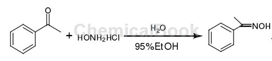 add 6.4ml (55mmol) acetophenone, 6g (86mmol) hydroxylamine hydrochloride, 4ml newly prepared distilled water and 20ml 95% ethanol into the reaction bottle, add 11g (275mmol) solid sodium hydroxide in batches in an ice bath, this when the solution becomes a white turbid liquid, heat it up and reflux for five minutes. after cooling, pour the solution into a beaker containing 30 ml of concentrated hydrochloric acid and 200 ml of water to obtain a white solid acetophenone oxime with a melting point of 58°c to 60°c. the melting point in the literature is 55℃~56℃.