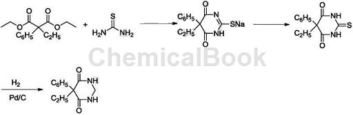 1. obtained from diethyl phenylmalonate through ethylation. 2. benzyl cyanide reacts with ethanol in the presence of sulfuric acid to form ethyl phenylacetate. the obtained ethyl phenylacetate is subjected to condensation reaction with diethyl oxalate and sodium ethoxide after rectification, and is then subjected to ethylation reaction with ethyl bromide after hydrochloric acid precipitation to generate diethyl phenylethyl malonate. the finished product is obtained by fractional distillation under reduced pressure. another production method is the condensation of ethyl phenylacetate with diethyl carbonate and ethyl bromide.