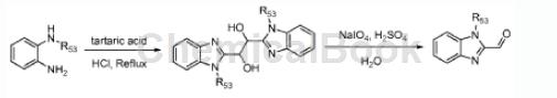 step 2: add 1,2-bis(1-methyl-1h-benzo[d]imidazol-2-yl)ethane-1,2-diol (4.9g, 15.2mmol) and naio4 ( 3.3g, 15.2mmol) solution (150ml) was added dropwise with 3nh2so4 aqueous solution (18ml). after stirring at ambient temperature overnight, the mixture was adjusted to ph 8 with aqueous na2co3 solution. the precipitate was collected by vacuum filtration and washed with water and ethanol. the solid was dried to obtain 3.11 g of the desired product 1-methyl-2-formylbenzimidazole. lc-ms: m/z161 (m+h+).