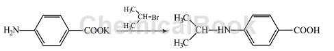 add 2.5 g (0.02mol) 2-bromopropane to the prepared potassium p-aminobenzoic acid salt solution, and heat and reflux for 12 hours until the 2-bromopropane in the lower layer basically disappears, and a small amount of solid precipitates. after cooling, a large amount of solid precipitated. the solid was filtered out and recrystallized with isopropyl alcohol (added activated carbon for decolorization) to obtain white crystals, which were dried to obtain 1.5 g of the product 4-(n-isopropylamino)-benzoic acid. rate 51%, m p 160~161°c, irυ max /cm–1: 3408 (n-h stretching), 3200 (-oh), 2970 (c-h stretching, 1720 (c=o), 1525, 1580, 1600 (benzene ring), 1379, 1384 (bimodal, isopropyl), 837 (para-substituted benzene ring).