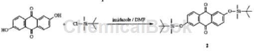 step 1: add 2,6-dihydroxyanthraquinone (80.0g, 0.33mol), imidazole (108.8g, 1.6mol), tert-butyldimethylsilyl chloride (115.5 g, 0.77mol) and dmf. 600ml. the dark red mixture was heated to 90°c for 3 hours. tlc indicated the reaction was complete. the reaction was cooled and poured into 2l cold water. the dark green needle-like precipitate was filtered off and washed with water and methanol. dissolve the dark green crystals in ether and filter out the black insoluble portion. the bright yellow filtrate was concentrated and the crude product was suspended in boiling methanol. the yellow precipitate was filtered to obtain 85.1g of pure product in the form of yellow filamentous crystals with a yield of 54%. 1hnmr (cdcl3) δ (ppm): 0.28 (s, 12h), 1.00 (s, 18h), 7.14 (dd, j1=8.5hz, j2=2.5hz, 2h), 7.64 (d, j=2.5hz, 2h ), 8.17 (d, j=8.5hz, 2h). 13cnmr (cdcl3): -4.36, 25.53, 117.35, 125.34, 127.57, 129.73, 135.73, 161.26, 182.17. melting point 131-133℃. fd-ms: m/z468 (m+).