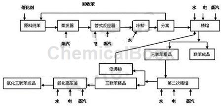① mixing: mix pure benzene and catalyst in the circulation tank, and then pump it into the benzene evaporator for evaporation; ② cracking: a certain amount of benzene vapor enters the heat exchanger and is preheated before entering the tubular reactor. benzene steam reacts in the tubular reactor; ③ cooling: the reaction gas enters the heat exchanger from the tubular reactor, and is cooled after heat exchange, so that the gas benzene, biphenyl and terphenyl are cooled into liquids;