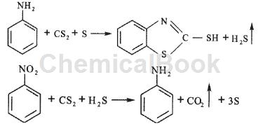 aniline, nitrobenzene method (continuous method): aniline, nitrobenzene and recycled benzothiazole are mixed according to a certain mass ratio to prepare raw material nex (the mass of nitrobenzene accounts for 0-40% of the mass of nex) , carbon disulfide and sulfur are mixed to form the raw material cas, and then the two materials are pumped into the high-pressure reactor in a certain proportion by a high-pressure pump, and react at a temperature of 220-280°c and a pressure of 7mpa to generate accelerator m, benzothiazole, and hydrogen sulfide the mixture is decompressed from the autoclave and discharged into the stripping tower. after stripping, the crude accelerator m is obtained from the liquid phase. the crude accelerator m is purified by an acid-base method or a solvent method to obtain the finished accelerator m; the gas phase after cooling and condensation, the thiazole and carbon disulfide are recovered, and the hydrogen sulfide gas is sent to the incineration equipment to prepare sulfuric acid and by-product steam. this method realizes continuous operation and safety interlocking, has a high degree of self-control, good production operating environment and safety, the mixing of materials is better than intermittent production, and realizes the recovery and application of benzothiazole. the yield based on aniline is at about 89%, we are currently exploring ways to enhance material mixing by adding a reactor stirring device, adjusting the proportion of nitrobenzene mass to nex mass, and using catalysts that can lower temperature and pressure, increase yields, and reduce by-products to optimize production. process to further improve product yield. the reaction formula of aniline and nitrobenzene synthesis accelerator m is as follows:
