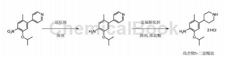 add 400.0l methanol and 50.0kg 4-(5-isopropoxy-2-methyl-4-nitrophenyl)pyridine into the 1000l hydrogenation reaction kettle. use vacuum and 0.5mpa argon in the kettle. replace the gas three times, add 5.0kg of 10% wet palladium on carbon (1.5kg on a dry basis), use vacuum and 0.5mpa hydrogen to replace the kettle three times, maintain the reaction pressure at 0.5mpa, the temperature at 30°c, and react for 5 hours. filter the reaction solution and store the catalyst temporarily so that it can be reused in subsequent batches. add the filtrate into a 1000l hydrogenation reaction kettle, add 30.6l concentrated hydrochloric acid, use vacuum and 0.5mpa argon to replace the kettle three times, add 14.5kg 10% wet platinum carbon (dry basis 5.0kg), use vacuum and 0.5mpa hydrogen in the kettle replace three times, maintain the reaction pressure at 1.2mpa, the temperature at 30°c, and react for 16 hours.