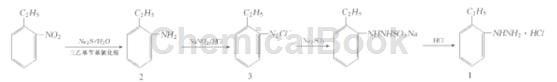 method 1: use o-ethylnitrobenzene, a by-product of the production of p-ethylnitrobenzene, as the raw material, triethylbenzylammonium chloride as the phase transfer catalyst, and use sodium sulfide to reduce it to o-ethylaniline (2 ). then 2 is diazotized, and o-ethyldiazobenzene is reduced with sodium sulfite to obtain o-ethylphenylhydrazine sulfonate, and hydrochloric acid is added to precipitate 1. based on o-ethylnitrobenzene, the total yield is 86.4%,