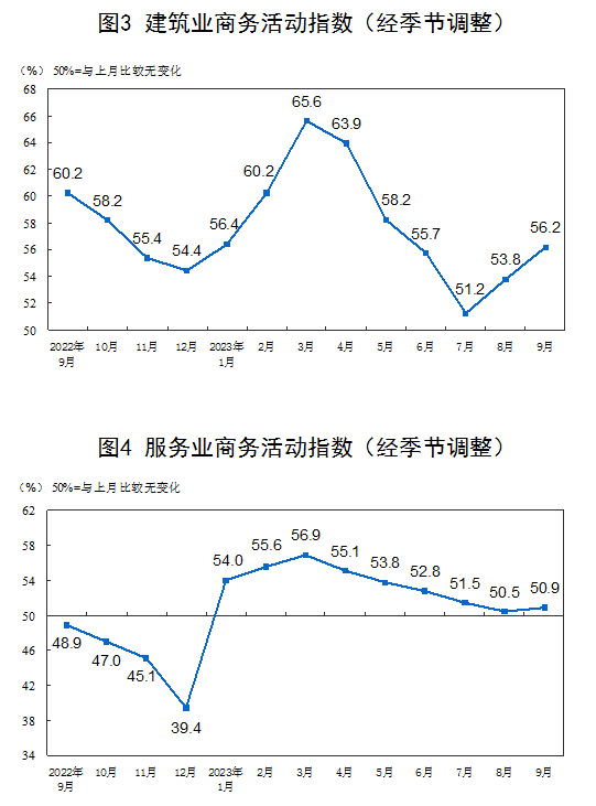 in terms of industries, the business activity index of the construction industry was 56.2%, an increase of 2.4 percentage points from the previous month; the business activity index of the service industry was 50.9%, an increase of 0.4 percentage points from the previous month. from an industry perspective, the business activity index of water transportation, postal service, telecommunications, radio, television and satellite transmission services, internet software and information technology services, monetary and financial services and other industries is in the high prosperity range of above 55.0%; railway transportation, air transportation, accommodation, catering the business activity index of other industries is below the critical point.