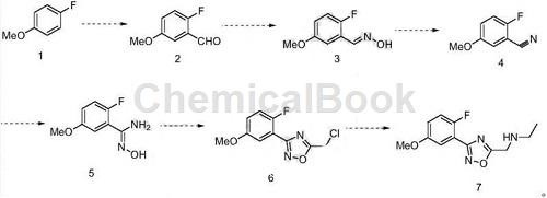 n-((3-(2-fluoro-5-methoxyphenyl)-1,2,4-oxadiazol-5-yl)methyl)ethylamine and related derivatives in medicinal chemistry and has wide applications in organic synthesis. at present, the synthesis of n-((3-(2-fluoro-5-methoxyphenyl)-1,2,4-oxadiazol-5-yl)methyl)ethylamine is relatively difficult. therefore, it is necessary to develop a synthesis method with easily available raw materials, convenient operation, easy control of the reaction, and suitable overall yield. research has developed a fluorine-containing benzene-substituted oxadiazole compound n-((3-(2-fluoro-5-methoxyphenyl)-1,2, 4-oxadiazole-5-yl)methyl ) the preparation method of ethylamine uses 4-fluoroanisole as the starting material and undergoes aldehydeylation, oximation, elimination, addition, ring closure, and substitution reactions to obtain the target product.