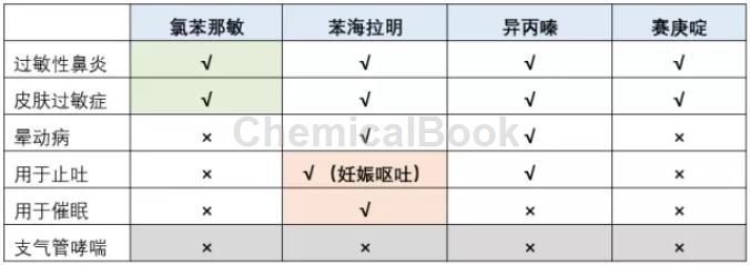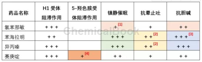 [1] chlorpheniramine has the weakest sedative effect; [2] diphenhydramine and promethazine can be used for motion sickness, radiation sickness, nausea and vomiting caused by surgery and drugs; [3] diphenhydramine lamin can be used to fight parkinson’s disease and drug-induced extrapyramidal symptoms; [4] cyproheptadine can stimulate appetite and increase weight.