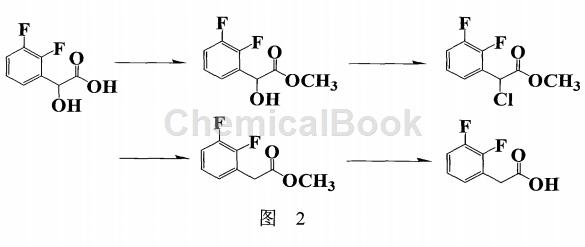 german patent wo2008078350 (figure 2) reports that 2,3-difluoro-mandelic aid is used as a starting material to prepare 2,3-difluorophenylacetic acid after esterification, chlorination, reduction, alkaline hydrolysis and acidification. due to the numerous steps, the yield is low (44.2%), and the starting materials are expensive and are not suitable for industrial production.