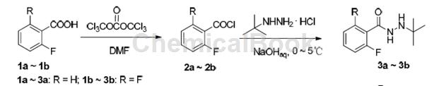 its synthesis can use 2,6-difluorobenzoic acid as raw material, chlorinated form 2,6-difluorobenzoyl chloride, and the synthetic intermediate n-tert-butyl-n’-fluoro-substituted benzoyl hydrazide in the process of 3a~3b, a slight excess of sodium hydroxide and tert-butylhydrazine hydrochloride was used to prevent n-tert-butyl-n’-substituted benzoyl hydrazide 3a~3b from fluorine-substituted benzoyl chloride 2a ~2b further reacts to form a bis-acylated impurity. in addition, since the fluorine atom is an electron-withdrawing group, benzoyl chloride containing two fluorines at the ortho position of the benzene ring connected to the acyl group is more active than benzoyl chloride containing one fluorine, and tert-butylhydrazine is more likely to interact with 2, 6-difluorobenzoyl chloride (2b) undergoes nucleophilic substitution reaction, so the yield of 3b is slightly higher than that of 3a.