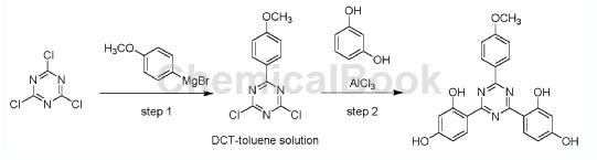 into a 1.5l glass reactor with an argon inlet, add 94 g of resorcinol (0.857 mol, 2.1 equivalents relative to dct/m) and 3.2 mol eq. benzonitrile (relative to dct/m) was added to a solution of 707 g of the corresponding dct/m in toluene. the resulting solution was heated to 60°c. then 112g alcl3 (0.842 mol, 2.07 equivalents relative to dct/m) was added in portions. after the addition is complete, the reaction mixture is maintained at 60°c approximately 20°c. stop heating after 4 hours of complete conversion. then 55ml 1n hcl (55mmol) was added dropwise, followed by 150ml toluene, 165ml 1n hcl (165mmol) and 150ml water. the resulting suspension was filtered, followed by washing with 350 ml of toluene and 1000 ml of water. the filter cake was sucked dry and then dried under vacuum (~100 mbar) at 60°c overnight to give the specified yield of 4,4′-[6-(4-methoxyphenyl) -1,3,5-triazine-2,4-diyl]-bis-1,3-benzenediol (mtb).
