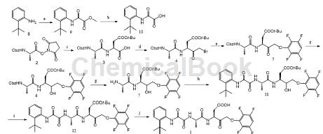 method 2: using pyruvic acid as raw material, reacting with l-alanine methyl ester through acyl chloride reactioncombine, then hydrolyze the methyl ester, continue the acid chlorination reaction, and react with (s)-3-amino-5-(2,3,5,6-tetrafluorophenoxy)-4-oxopentanoic acid tert-butyl ester after condensation, the pyruvate ketone is oxidized to obtain a carboxylic acid derivative. the acid chloride reaction is continued, and it is condensed with o-tert-butylaniline to form an amide. the tert-butyl protection is removed with trifluoroacetic acid to obtain the target product 1.