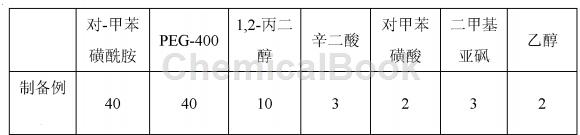 mix the solvent auxiliary materials peg-400, 1,2-propylene glycol, suberic acid, p-toluenesulfonic acid, dimethyl sulfoxide, and ethanol according to the adding proportion, heat to 80~110℃, stir, and make it into a clear and transparent oily liquid. gradually add p-toluenesulfonamide into the above-mentioned oily liquid and stir while adding. after it is fully dissolved, filter and cool to obtain p-toluenesulfonamide drug, in which each milliliter contains 345 mg of p-toluenesulfonamide.
