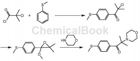 cn201810101151.4 provides a method for synthesizing free radical photoinitiators. this method can effectively reduce production costs and increase product yield during the synthesis process. the technical solution adopted by the present invention is as follows: a synthesis method of a free radical photoinitiator, including the following steps: (1) under the action of aluminum trichloride, using methylphenyl sulfide as raw material, and 2-chloroiso butyryl chloride undergoes friedel-crafts acylation reaction to produce intermediate a with a structure as shown in formula (ⅰ); (2) under the action of a base, intermediate a undergoes a cyclization reaction to produce a structure as shown in formula (ⅱ) intermediate b shown; (3) intermediate b undergoes a ring-opening reaction with morpholine to obtain the target product with a structure shown in formula (iii), which is the free radical photoinitiator. the method of the invention uses 2-chloroisobutyryl chloride and methylphenyl sulfide to carry out friedel-crafts acylation reaction, and then synthesizes the photoinitiator through steps such as cyclization and ring-opening. the obtained product has less impurities and a high yield. the process route is easy to operate, produces less three wastes, and is more environmentally friendly. the synthesis route of the free radical photoinitiator of the present invention is as follows: